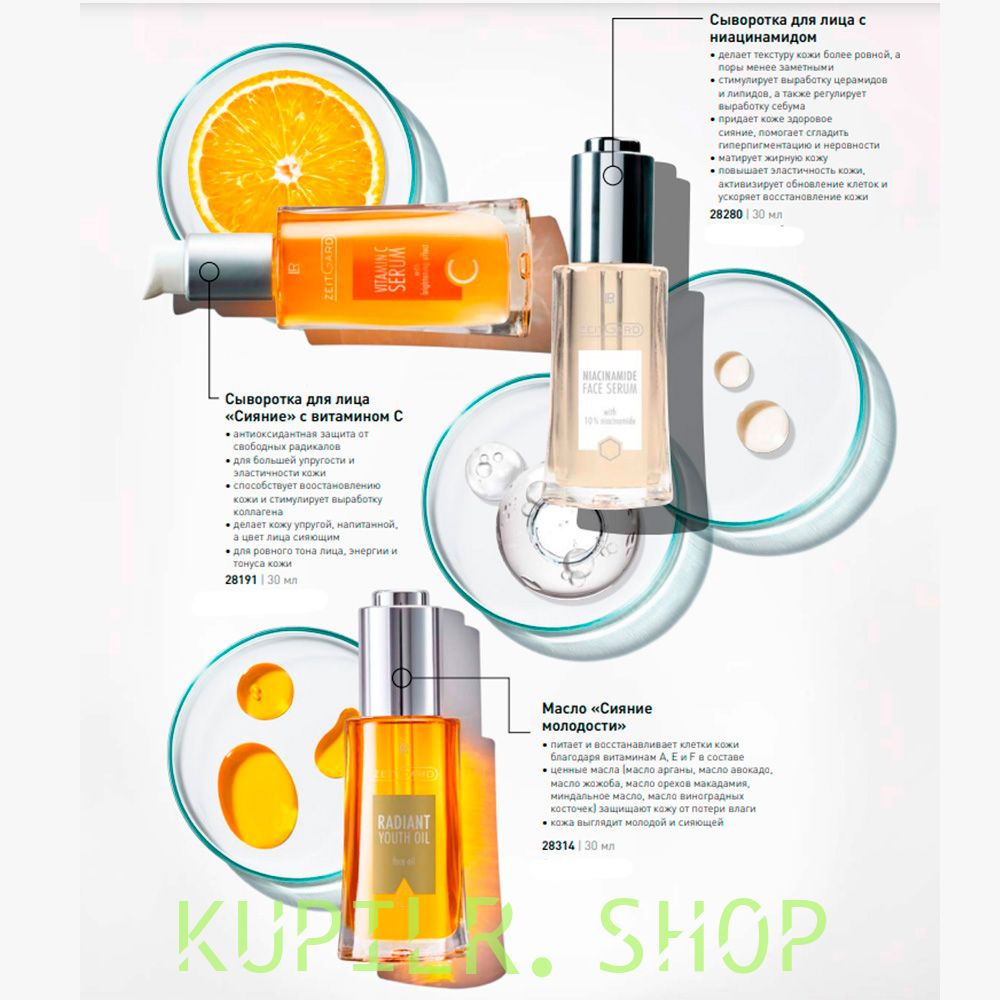 Сыворотка для лица «Сияние» с витамином С ZEITGARD, 30 мл - стимулирует выработку коллагена и способствует восстановлению кожи. Кожа становится более плотной и сияющей. Сыворотка также способствует осветлению пигментных пятен. Так называемый brightening effect («эффект осветления») приводит к коррекции пигментных пятен, а также регулирует образование меланина. Благодаря этому кожа выглядит более молодой и сияющей.