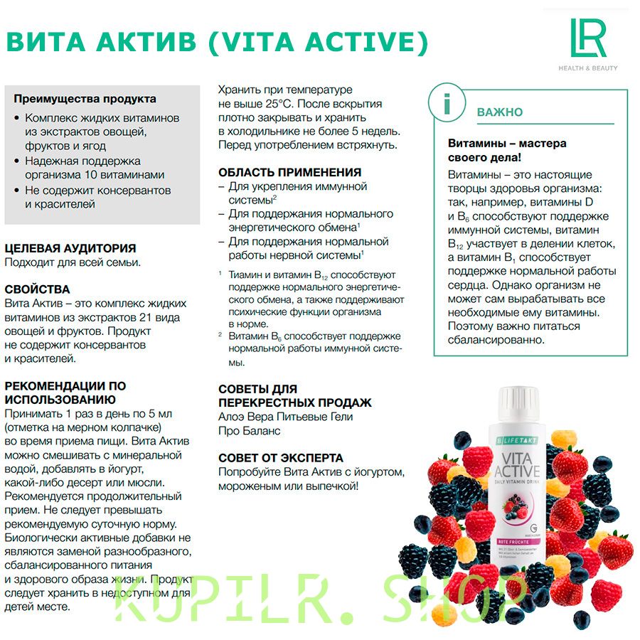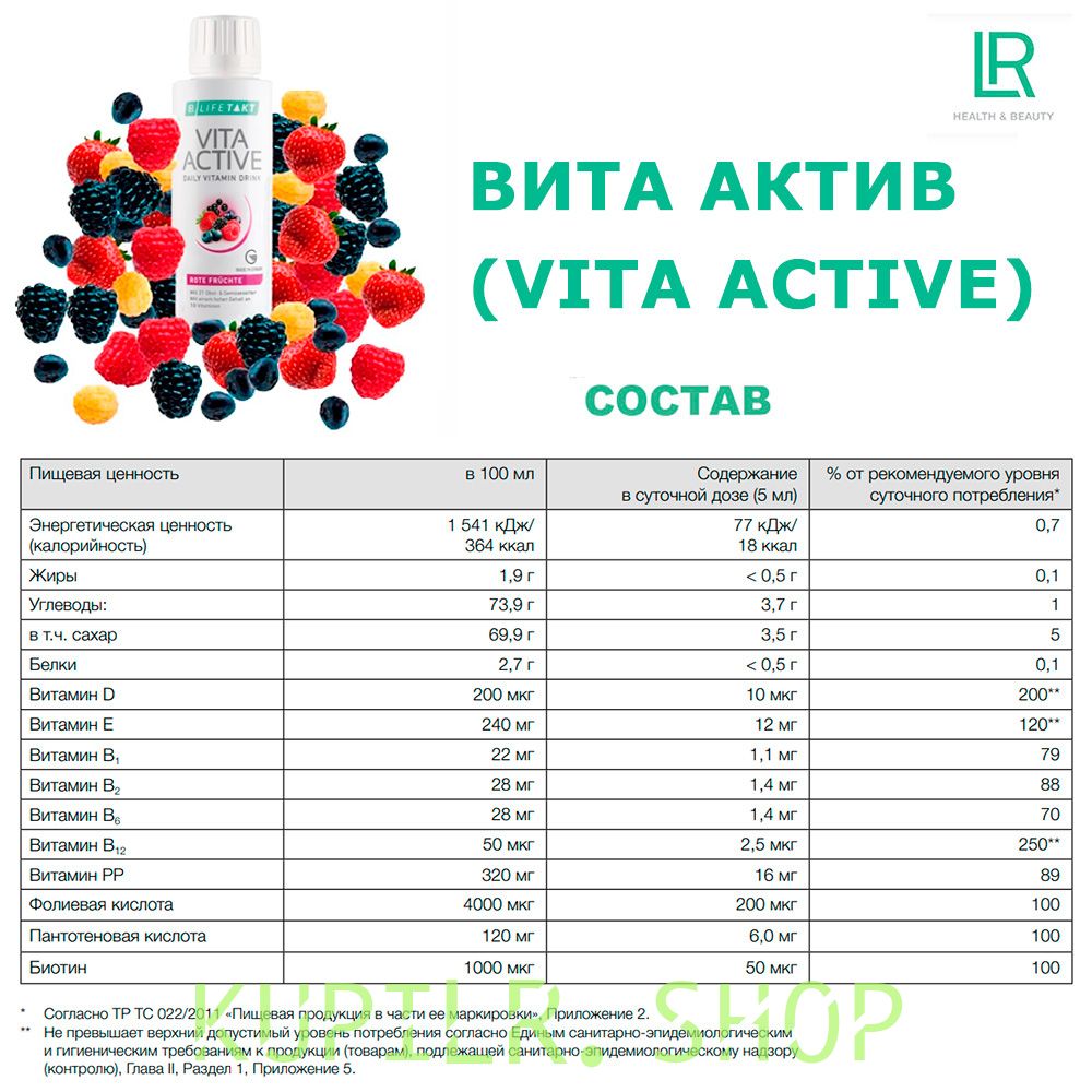 Вита Актив Комплекс Витаминов Красные Фрукты ЛР ЛАЙФТАКТ - 2 штуки (жидкость во флаконах по 150 мл.) - комплекс жидких витаминов из экстрактов 21 вида овощей и фруктов. Продукт не содержит консервантов и красителей.