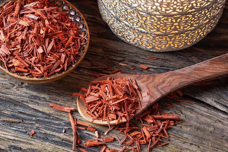 - обладает антибактериальными, успокаивающими свойствами. Растение богатое на танины, санталовую кислоту, птерокарпины. Также в составе древесины имеются красящие компоненты.